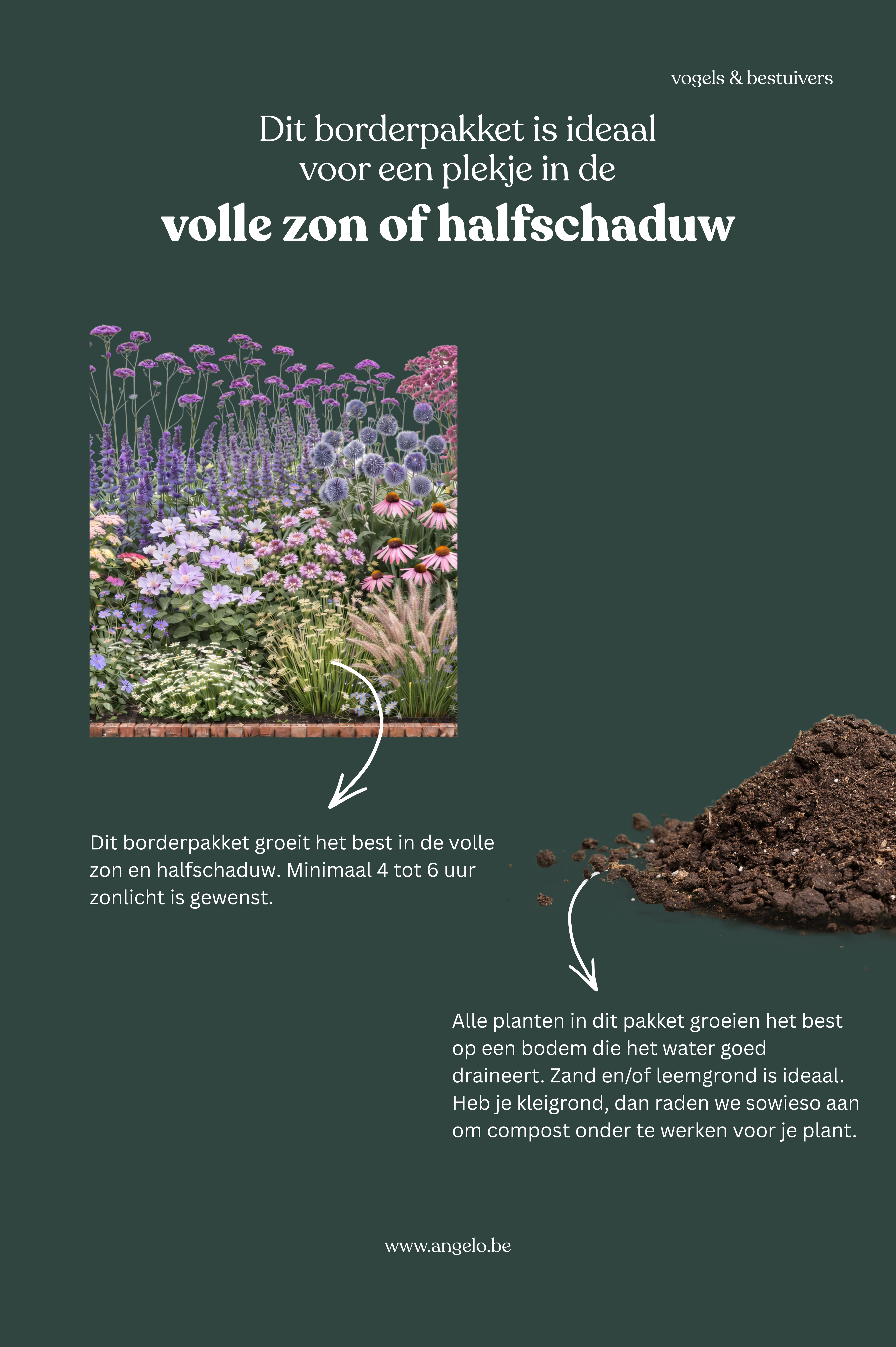 Geschikt voor een zonnige standplaats met goed doorlatende grond. Alle planten zijn winterhard, vrij droogtetolerant en vragen weinig onderhoud – ideaal voor een natuurlijke aanpak. Laat uitgebloeide bloemstelen staan tot het voorjaar voor de vogels en het overwinteren van insecten. Erg bijvriendelijk en ecologisch waardevol. Perfect voor wie een tuin wil die niet alleen mooi is, maar ook actief bijdraagt aan de lokale biodiversiteit.