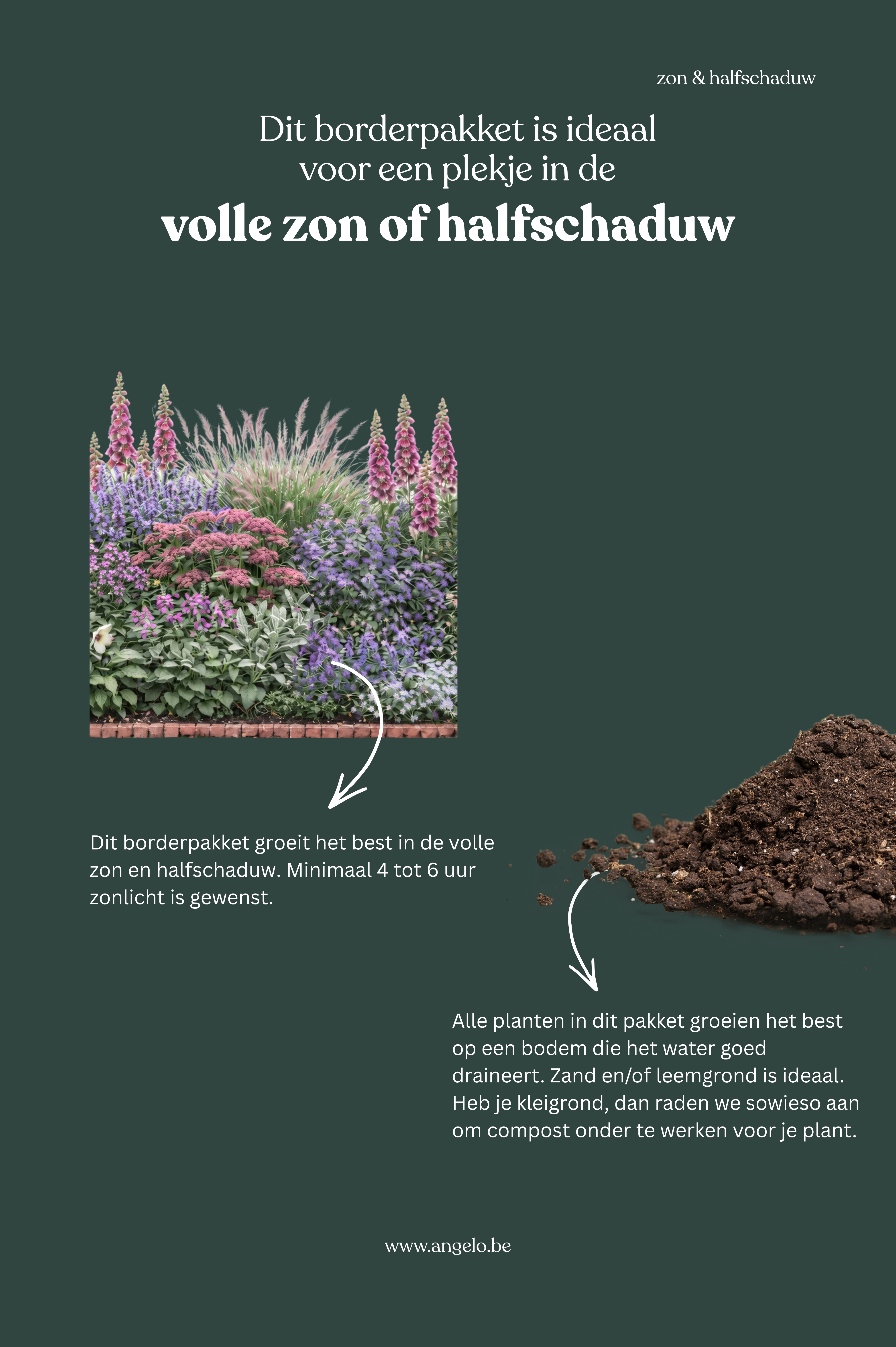 Een veelzijdig borderpakket voor de overgangszone tussen zon en schaduw. Deze doordachte plantenselectie floreert op plekken met wisselende lichtomstandigheden – ideaal voor borders langs hagen, onder kleine bomen of aan de oost- en westkant van het huis. Een mix van robuuste vaste planten die het hele seizoen kleur en structuur bieden.