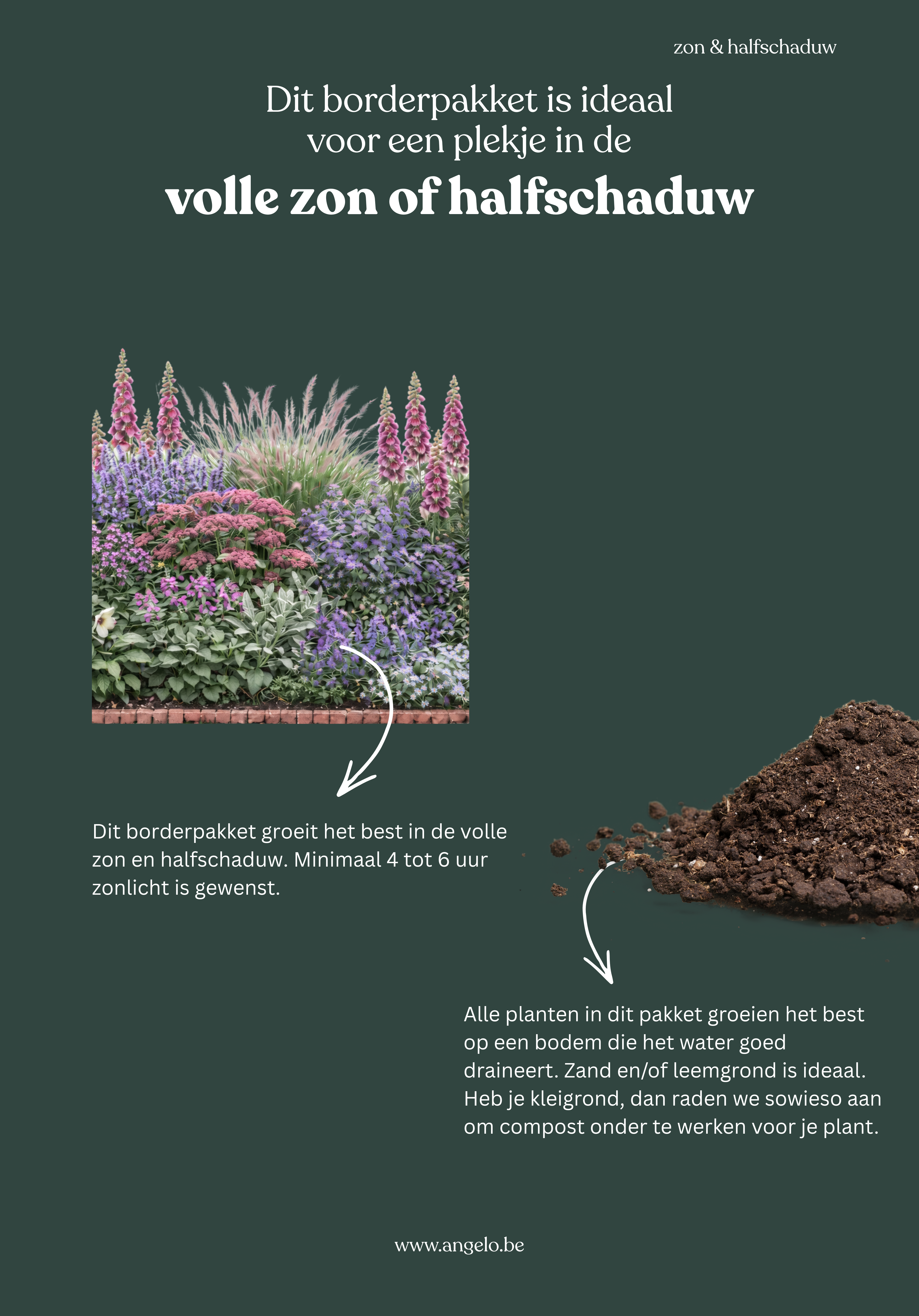 Angelo Dorny is tuinontwerper. Hij kent planten als geen ander en weet altijd de mooiste bordercombinaties te maken. Voor dit pakket selecteerde hij planten die zich moeiteloos aanpassen aan wisselende lichtomstandigheden – perfect voor die lastige overgangsplekken waar niet iedere plant even goed gedijt. Met dit borderpakket breng je Angelo's kennis van veelzijdige beplanting naar je eigen tuin.