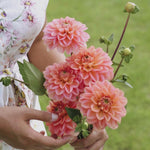 'Rosario' is een decoratieve dahlia met middelgrote bloemen. De kleur is roze met een vleugje abrikoos: prachtig! Sinds ik haar in de tuin heb, wil ik ze niet meer kwijt. Goede groeier, stevige donkere bloemstelen. Een zeer elegante dahlia om in boeketten te verwerken.