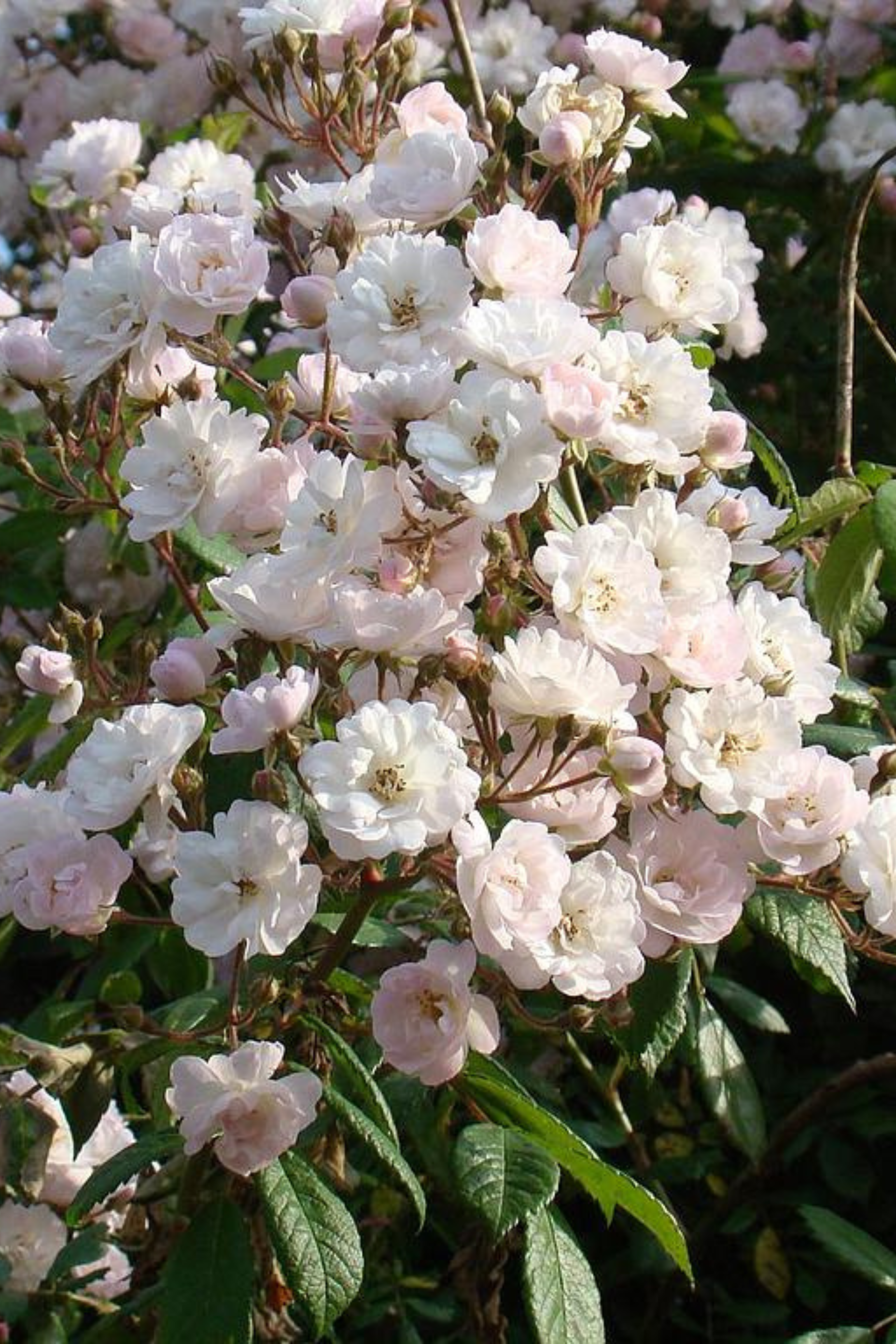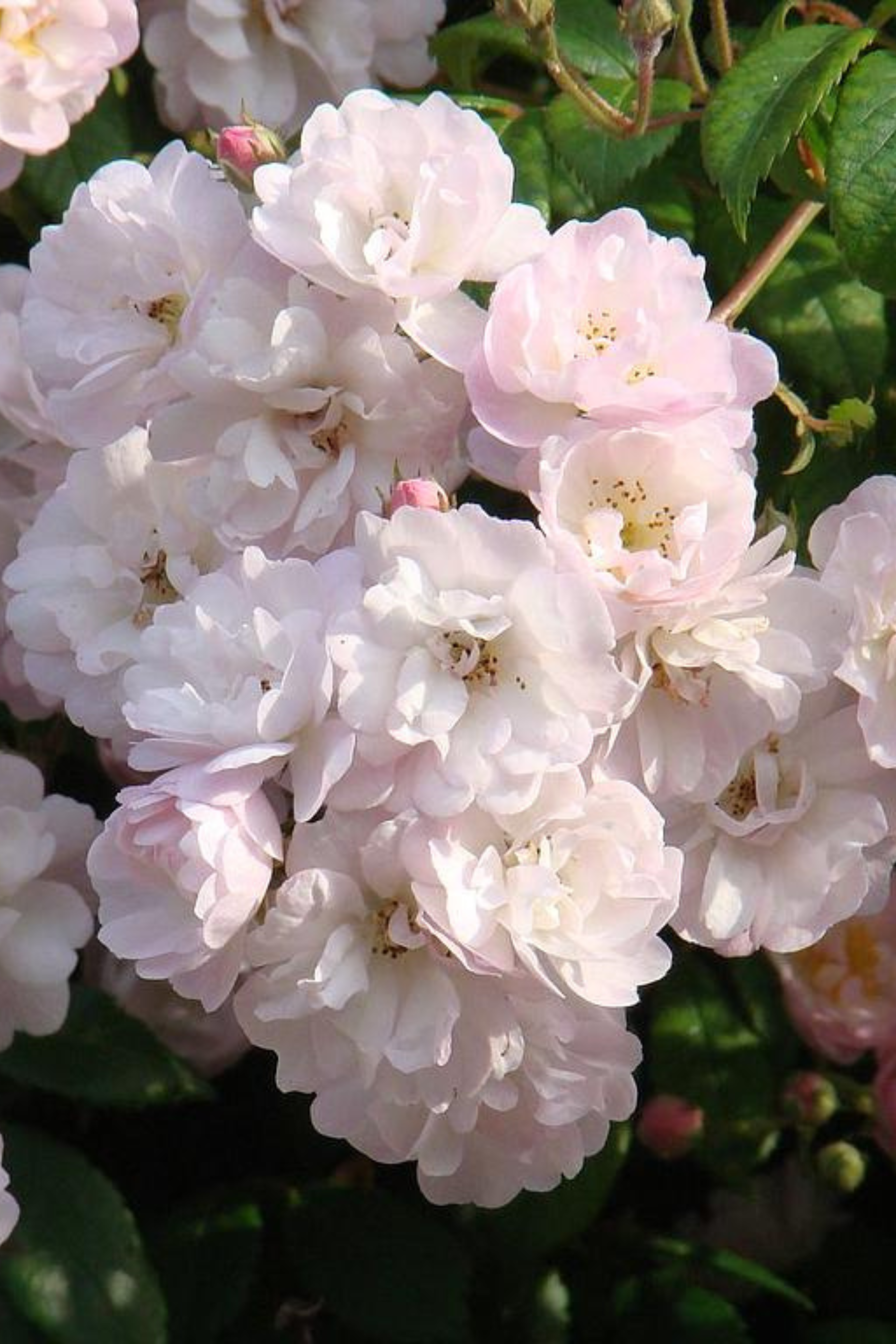 'Guirlande Rose' is een charmante ramblerroos die rijk bloeit met kleine, halfgevulde bloemen in zachtroze tinten die naar wit verkleuren. De bloemen verschijnen in grote trossen en geven een luchtige, speelse uitstraling. Deze roos bloeit eenmalig, maar zeer overvloedig in de vroege zomer en kan in korte tijd een prachtig bloemenspektakel creëren.