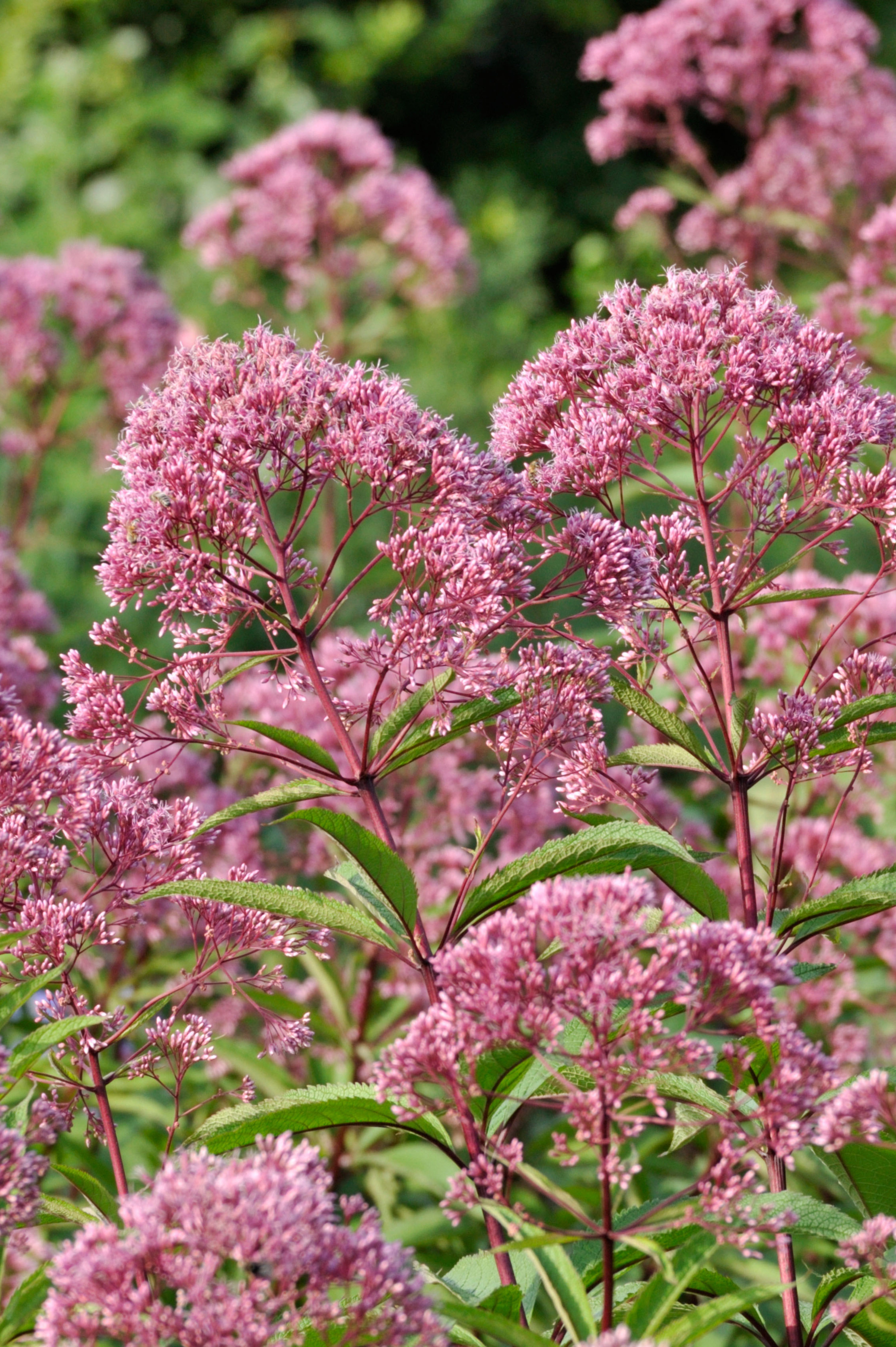 Indrukwekkend is wel het minste dat je kan zeggen over Eupatorium maculatum ‘Glutball’ of koninginnenkruid. Ze is een grote vaste plant met robuuste, rechtopstaande stelen en dieprode bloemschermen die van midden zomer tot de vroege herfst bloeien. De bloemen trekken bijen, vlinders en andere bestuivers aan en vormen samen een opvallend, warm accent in de border. Het donkergroene, veervormige blad vormt een stevige basis en benadrukt de intense bloemkleur.