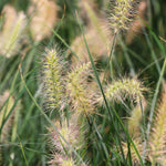 Pennisetum alopecuroides ‘Goldstrich’, ook wel lampenpoetsersgras genoemd, is een sierlijk, polvormend siergras met smalle, frisgroene bladeren die gekenmerkt worden door een opvallende gele middenstreep. In de nazomer, van augustus tot oktober, verschijnen de zachte, borstelvormige bloempluimen die eerst lichtgroen zijn en later verkleuren naar beige. Ze geven de plant een speels, luchtig karakter en zorgen voor beweging in de border.