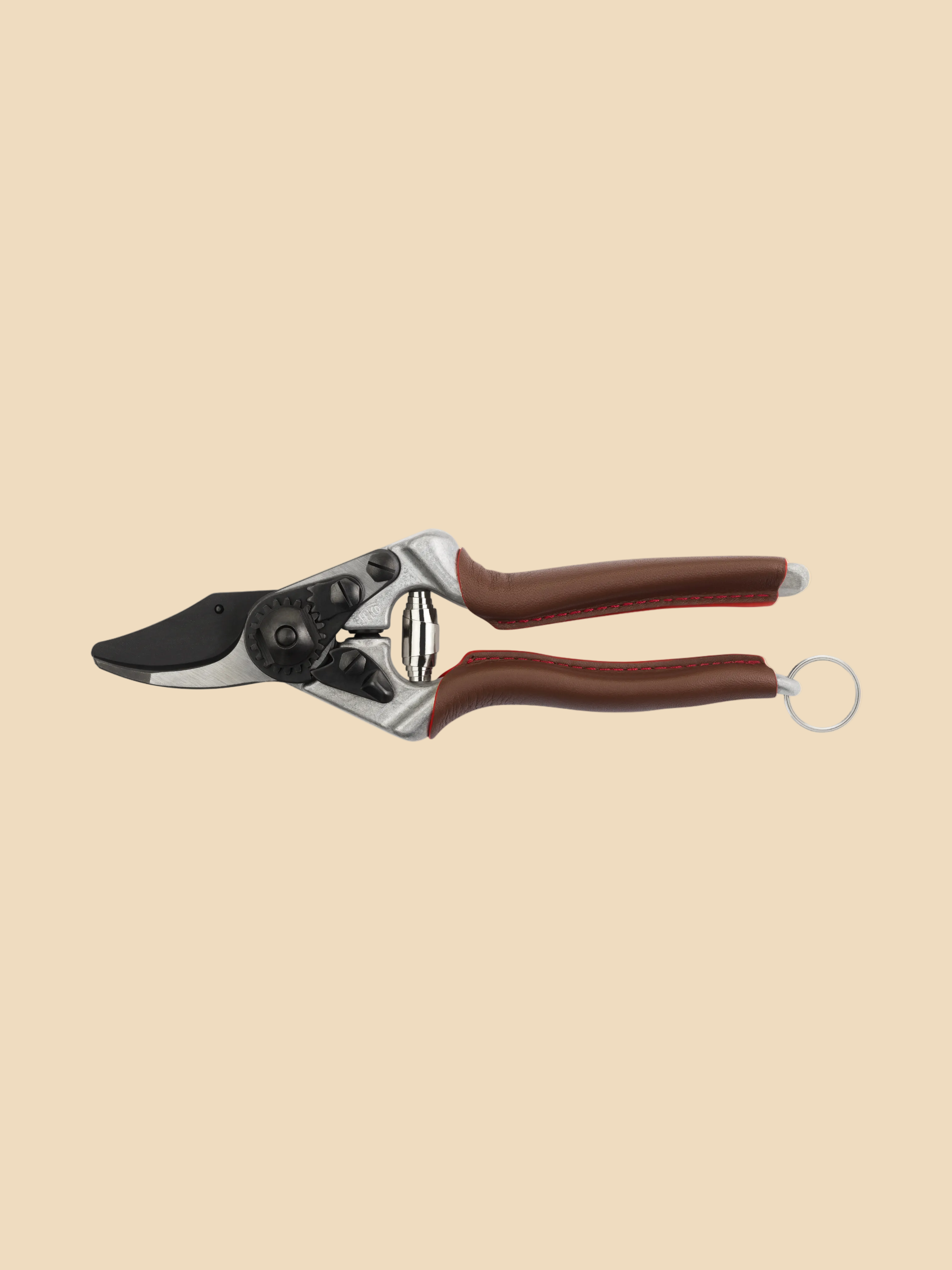 The Felco 6 Elite pruner is the most comfortable pruner you will ever experience. The handles are made from forged aluminum, but feature an anti-slip coating for an extra firm grip. The handles are wrapped in durable leather, providing additional comfort. This pruner is suitable for medium-sized hands.