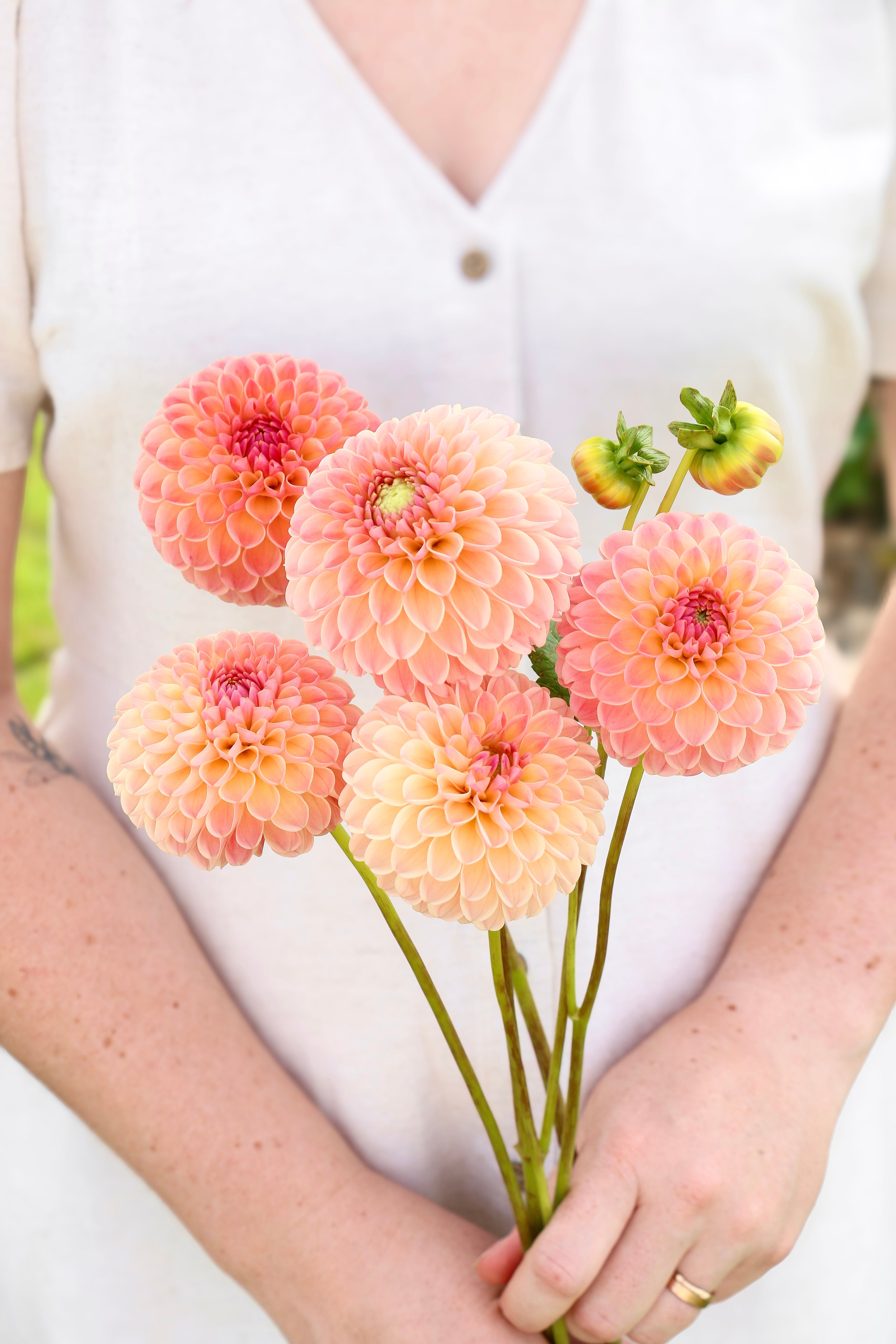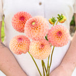 'L.A.T.E.' is a productive ball dahlia with compact blooms in a warm mix of apricot, peach, and soft pink hues. The plant grows robustly and produces many stems that are perfect for picking. Thanks to its good vase life, it is ideal for bouquets. A reliable and versatile dahlia that shines in any garden.