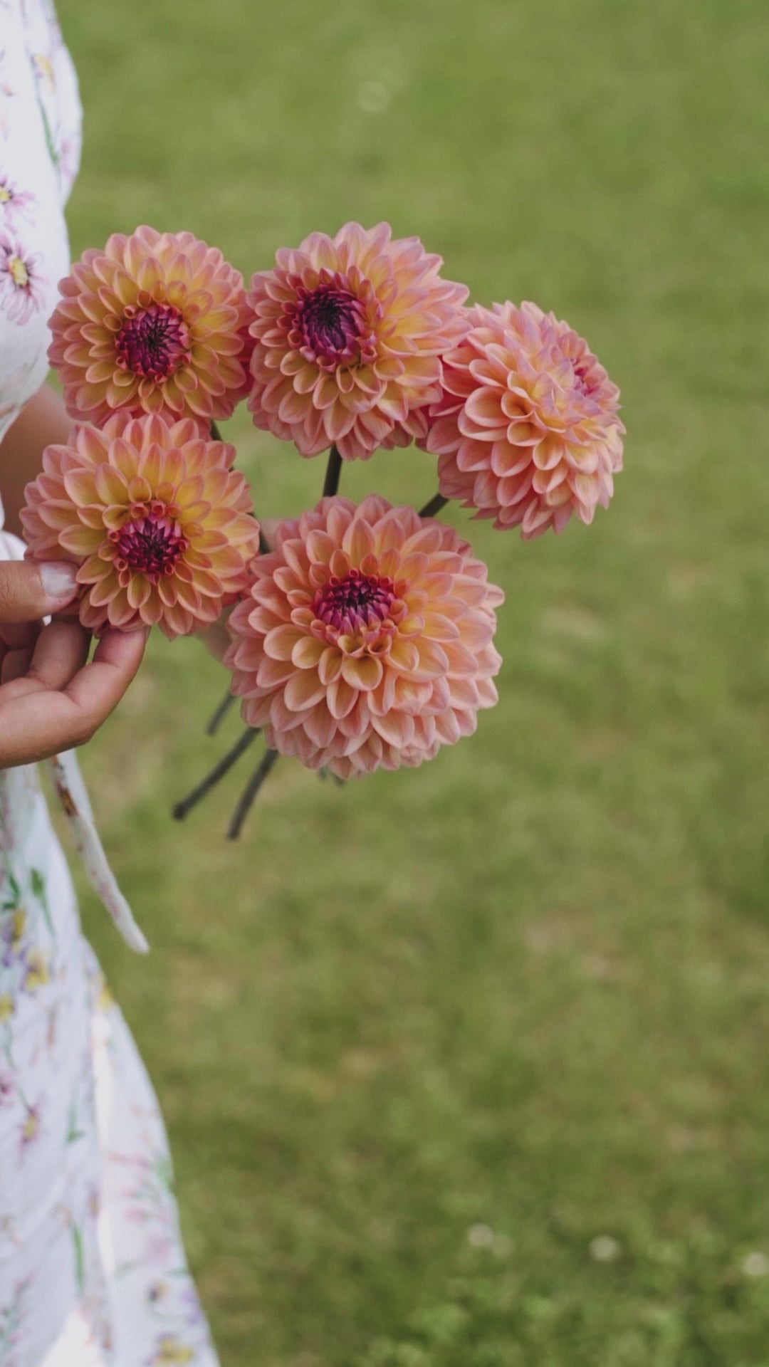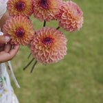 This decorative dahlia has large flowers in a peachy colour with a pale pink blush and a dark centre. She is truly beautiful! A discovery for me and immediately a fixture in my own garden. The flower stalks are quite dark and very firm. Very pretty in bouquets.