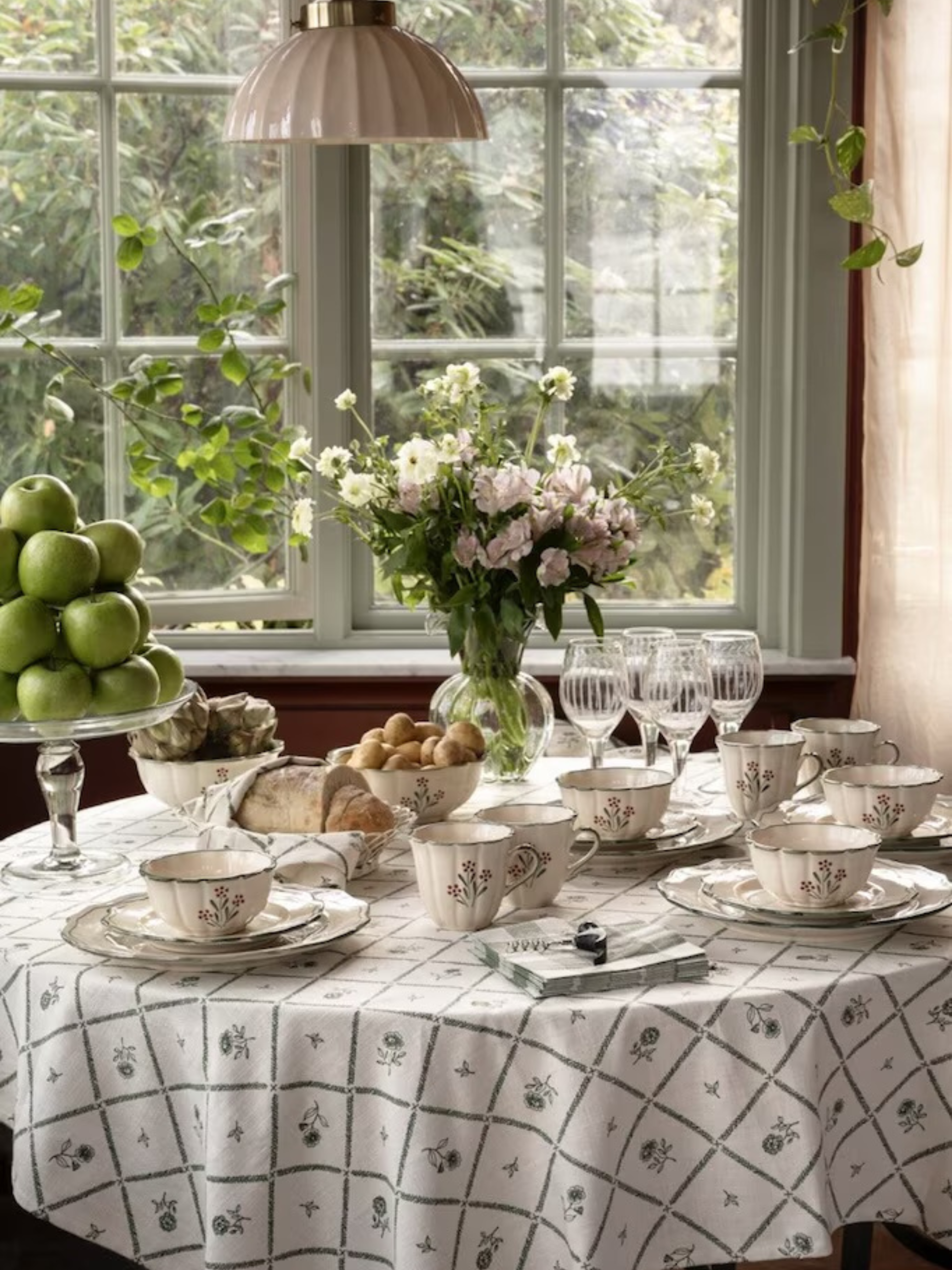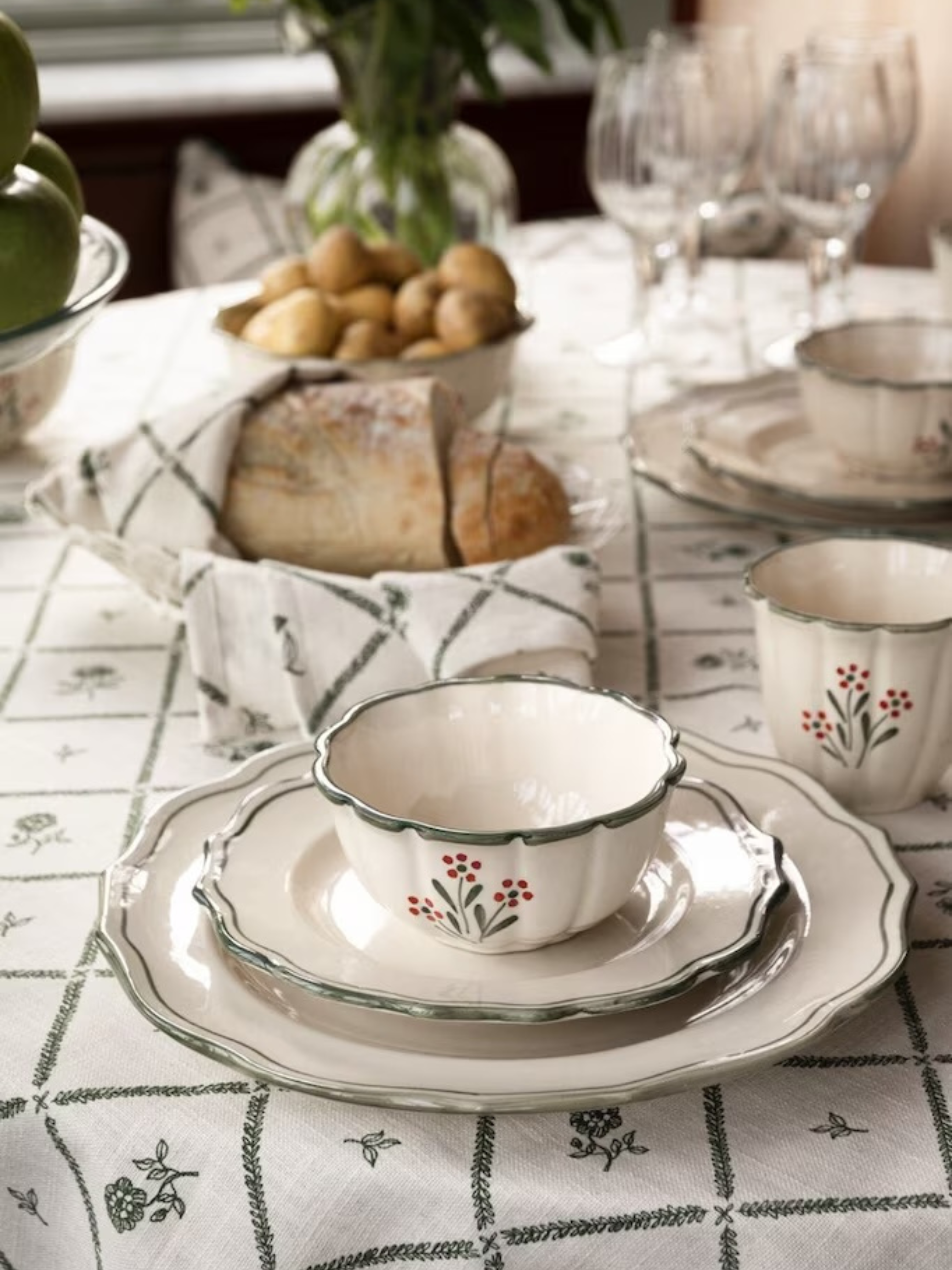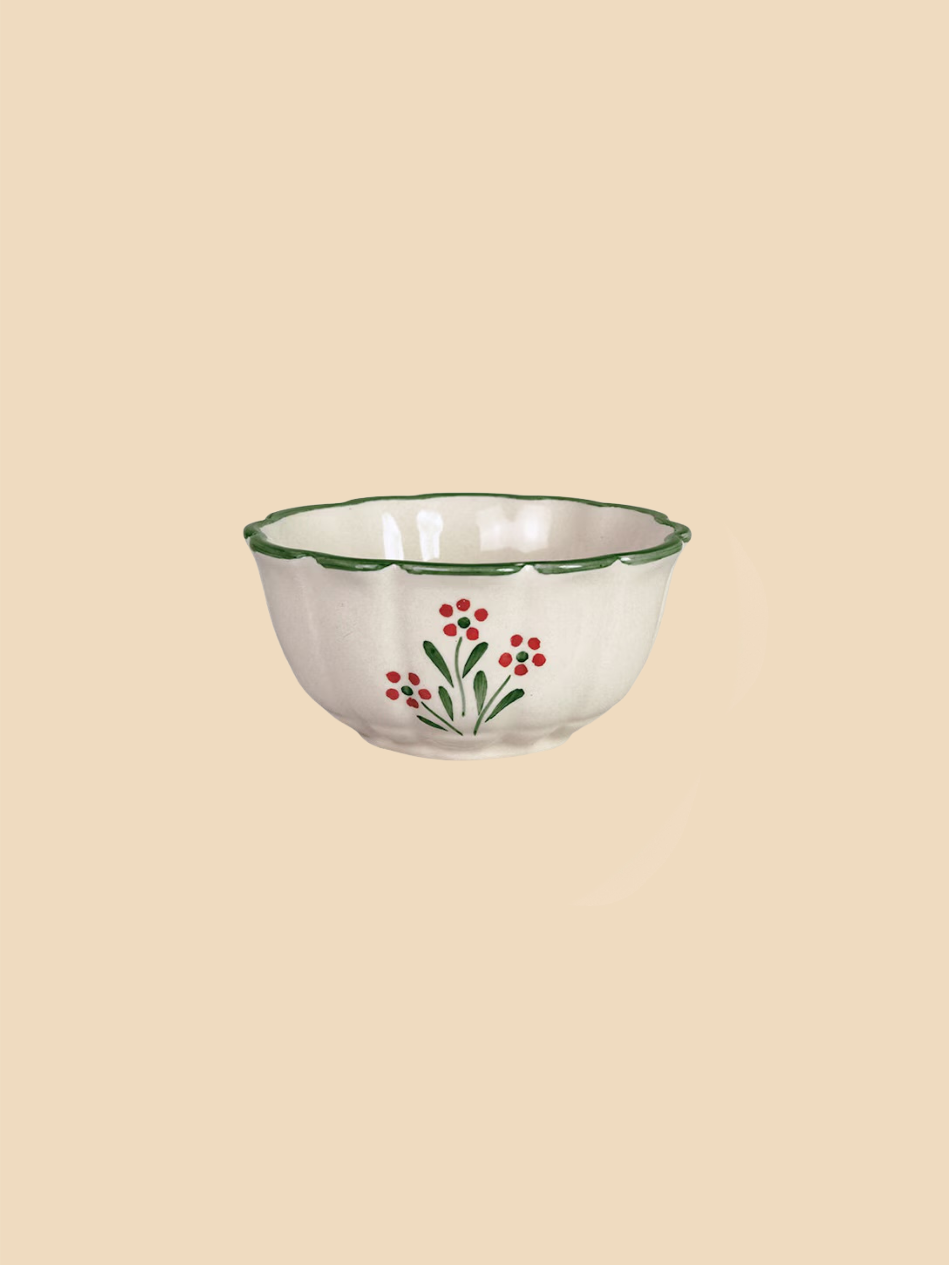 Een elegante kom in steengoed, afgewerkt met een handgeschilderd bloemenpatroon en een fijne groene rand. Het rustige, tijdloze ontwerp past moeiteloos bij andere stukken. Ideaal voor ontbijt, soep, snacks of een klein gerecht.