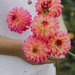 Deze dahlia is ietwat apart, en daarom is ze zo leuk. Ze doet denken aan een mini dinnerplate-dahlia. En de kleur is roze met een vleugje abrikoos: prachtig! Deze variëteit wordt niet hoog en kan daarom vooraan in de border worden geplant, of wanneer je ze goed kunt ondersteunen, ook in een pot of bak shinen.