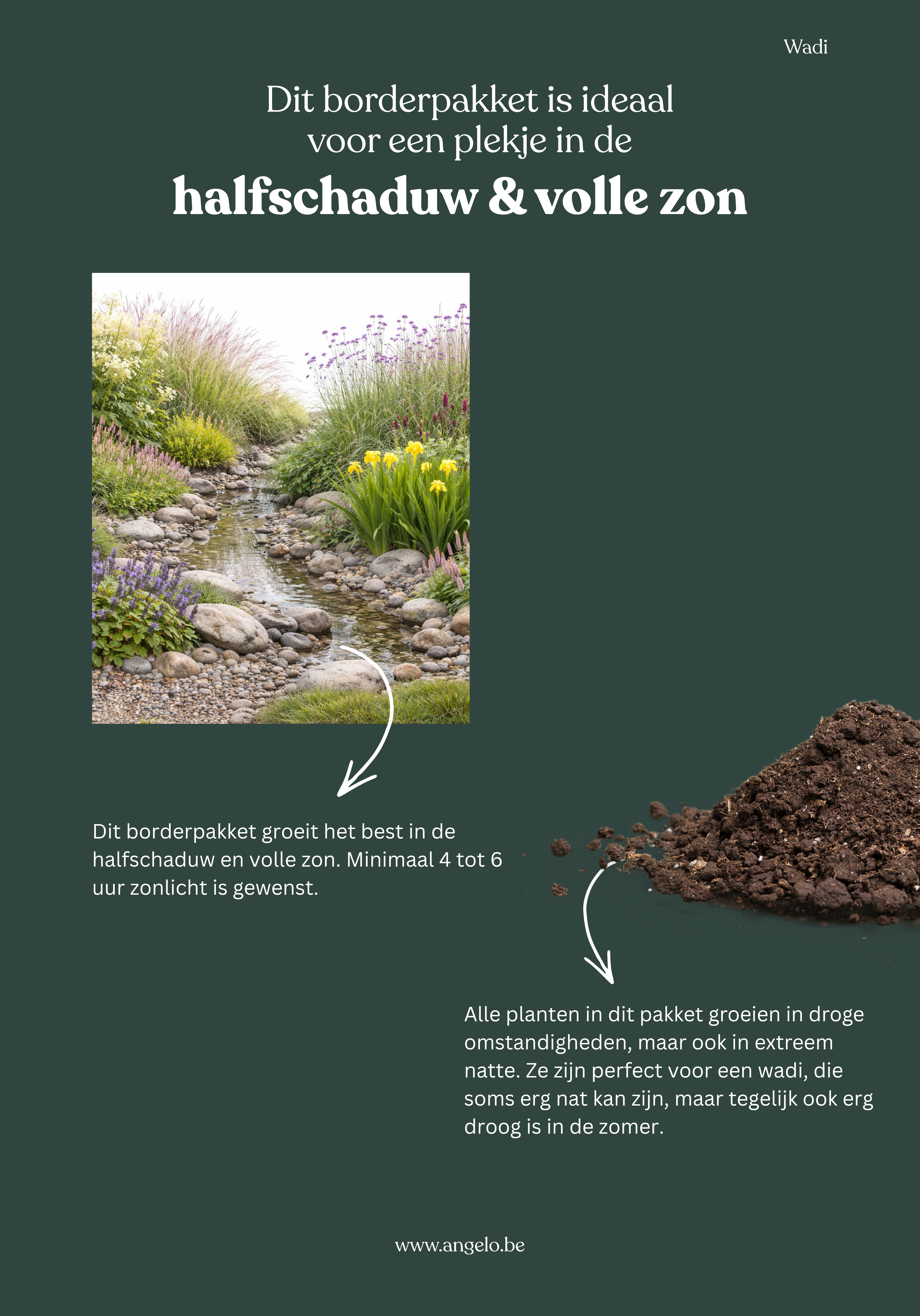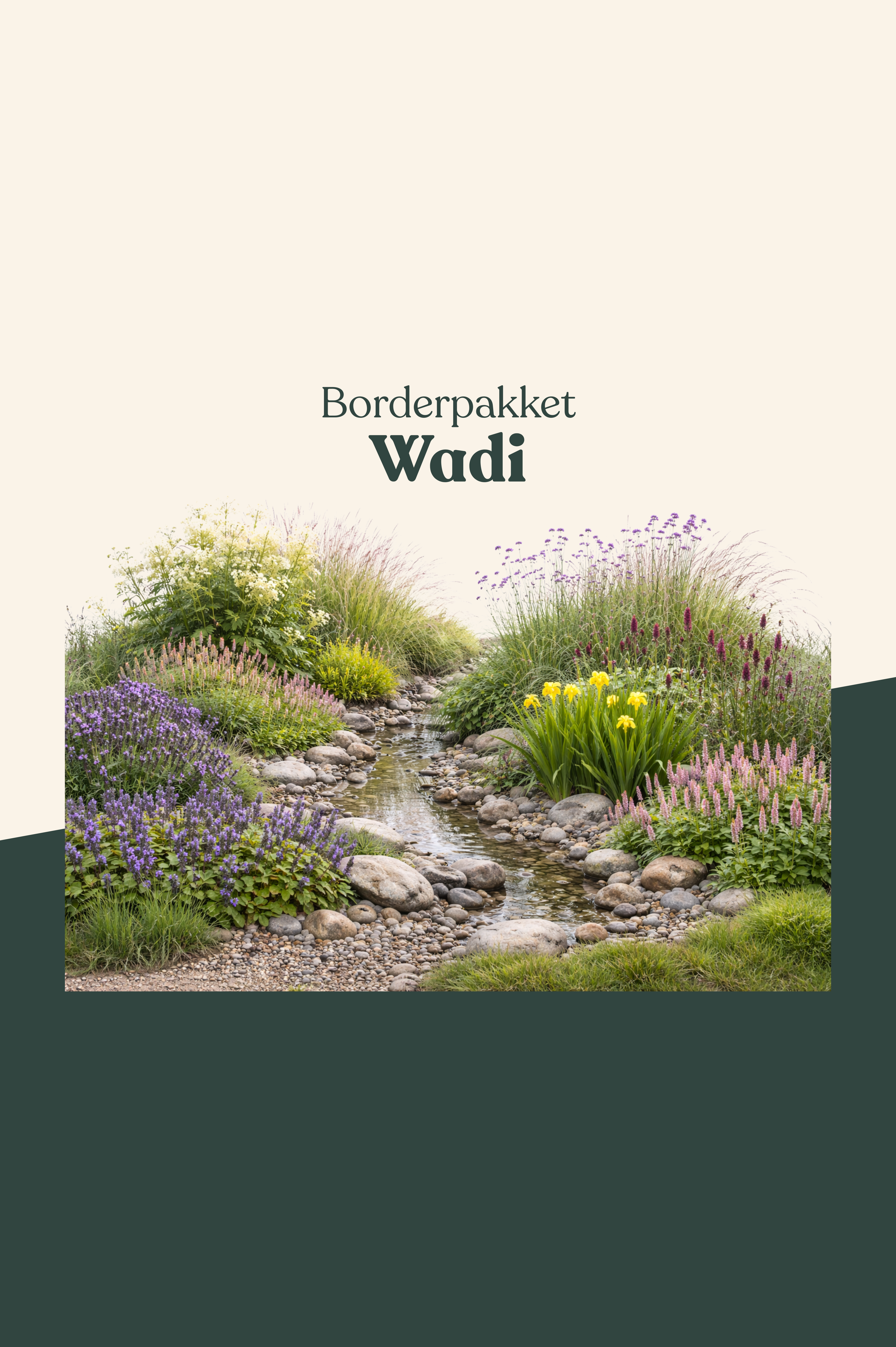 Dit borderpakket is ideaal voor een wadi of een plek met wisselende vochtigheid: nat in de winter en droger in de zomer. De planten zijn hier perfect op afgestemd en verdragen zowel tijdelijke wateroverlast als drogere periodes. Geschikt voor een zonnige tot licht halfschaduwrijke standplaats met een vochthoudende, goed doorlatende bodem. De planten zijn winterhard, sterk en onderhoudsvriendelijk. Laat uitgebloeide stengels staan tot het voorjaar voor extra structuur, voedsel voor vogels en schuilplekken voor insecten.