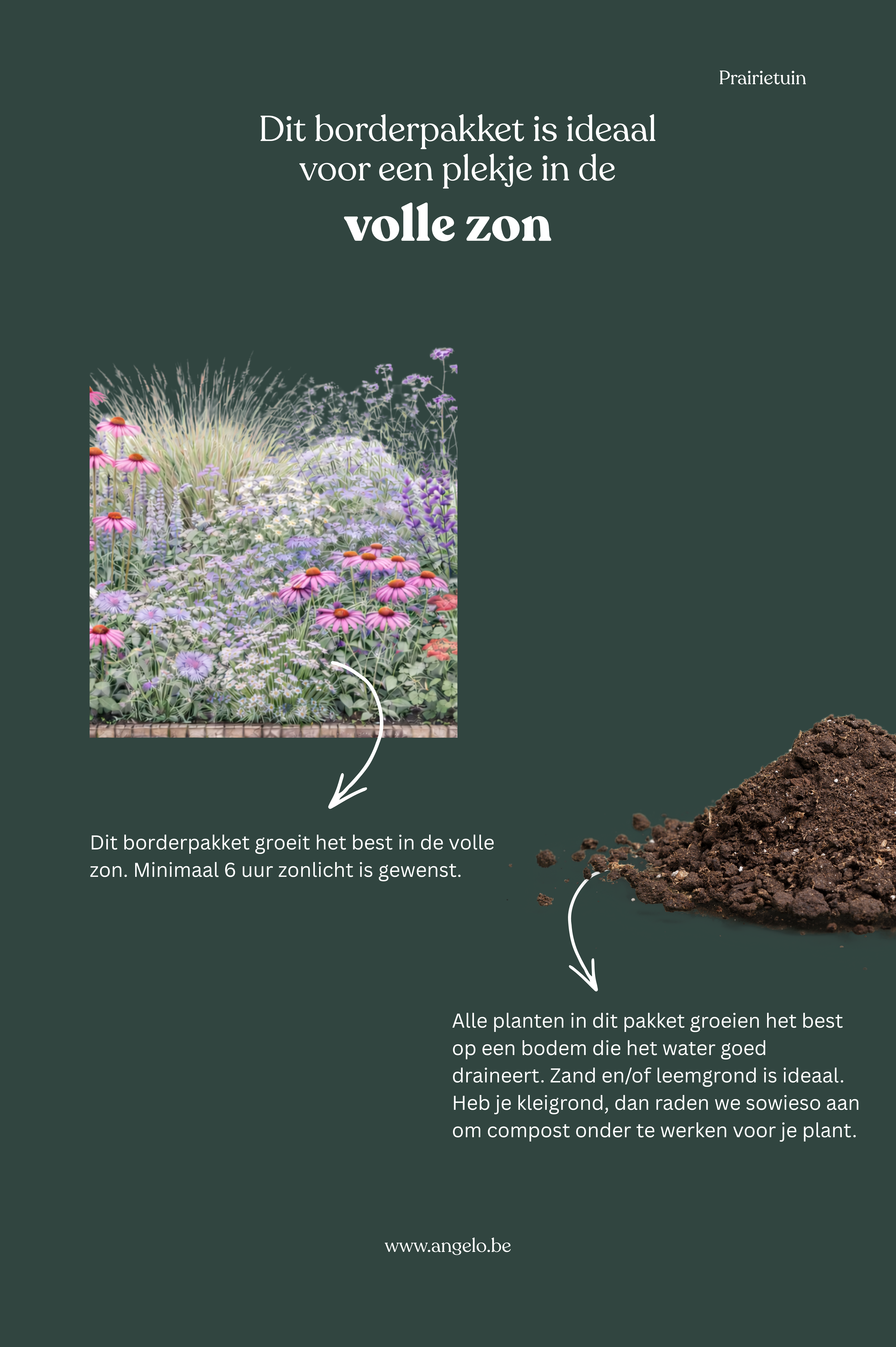 Angelo Dorny is tuinontwerper. Hij kent planten als geen ander en weet altijd de mooiste bordercombinaties te maken. Voor dit pakket selecteerde hij bewust planten die de sfeer van de prairie oproepen: robuust, luchtig en vol leven. De nectarrijke bloemen trekken gedurende het hele seizoen bestuivers aan, terwijl de stelen en zaaddozen in herfst en winter erg nuttig zijn voor vogels. Met dit borderpakket breng je Angelo's visie van een wilde, biodiverse prairietuin naar je eigen achtertuin.