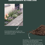 Geschikt voor een zonnige tot licht halfschaduwrijke standplaats met normale, goed doorlatende grond. Ideaal voor die typische geveltuinsituatie: niet te hoog zodat het uitzicht vanuit je raam vrij blijft, maar wel vol genoeg om impact te maken. De planten zijn winterhard en relatief onderhoudsvriendelijk, belangrijk voor een plek die je elke dag ziet. Ajuga reptans breidt zich langzaam uit en vormt een goede bodembedekker die onkruid onderdrukt. Verbena bonariensis zaait zichzelf gemakkelijk uit, wat bijdraagt aan dat spontane cottage tuin gevoel. Calamintha is een echte bijenplant die het hele seizoen bestuivers aantrekt, leuk om te zien vanaf je voordeur. Lythrum 'Blush' staat graag met de voeten in vochtige grond maar verdraagt ook normale tuingrond prima. Knip Astrantia terug na de eerste bloei voor een tweede bloeironde in het najaar.