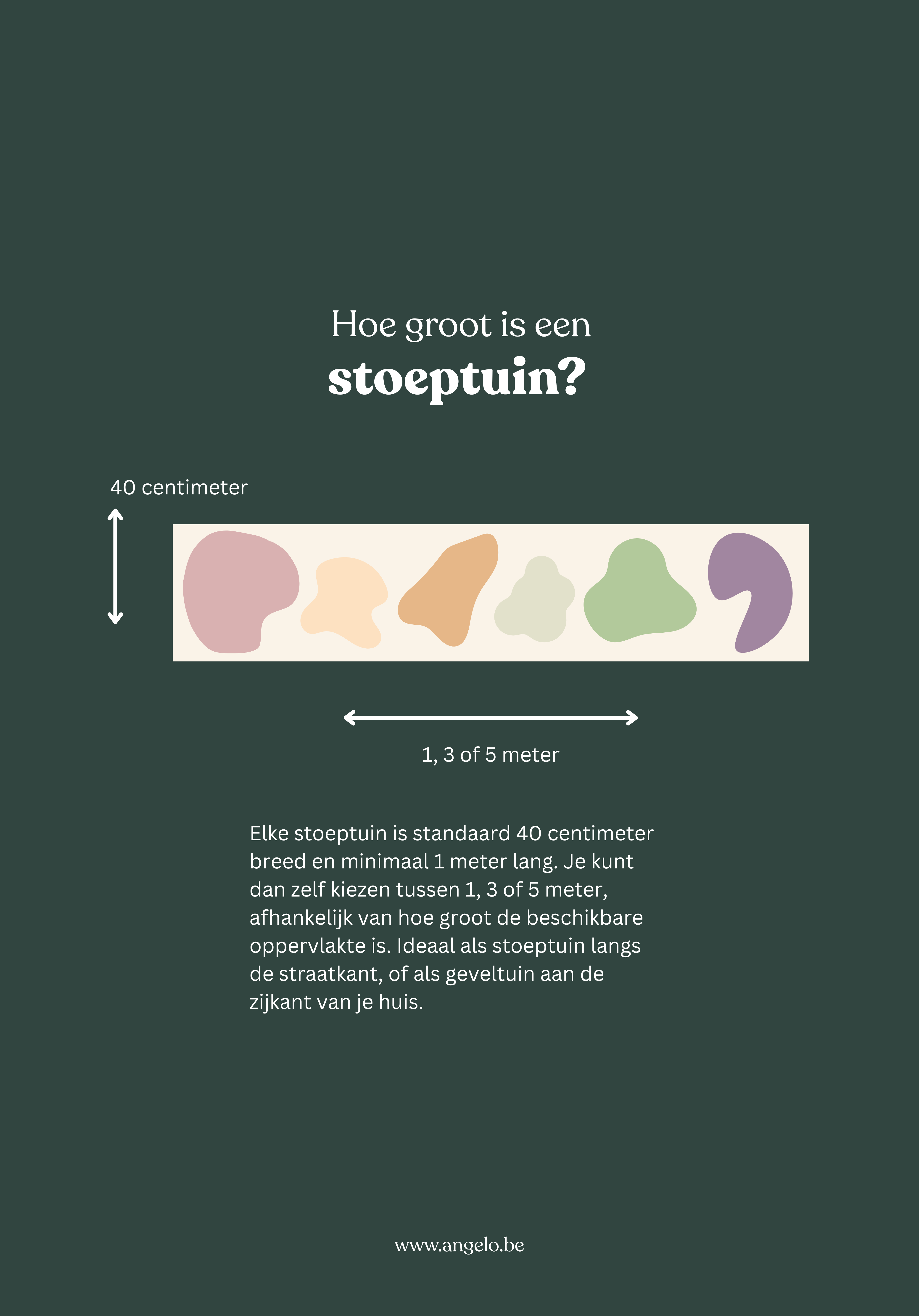 Elke stoeptuin is standaard 40 centimeter breed en minimaal 1 meter lang. Je kunt dan zelf kiezen tussen 1, 3 of 5 meter, afhankelijk van hoe groot de beschikbare oppervlakte is. Ideaal als stoeptuin langs de straatkant, of als geveltuin aan de zijkant van je huis.