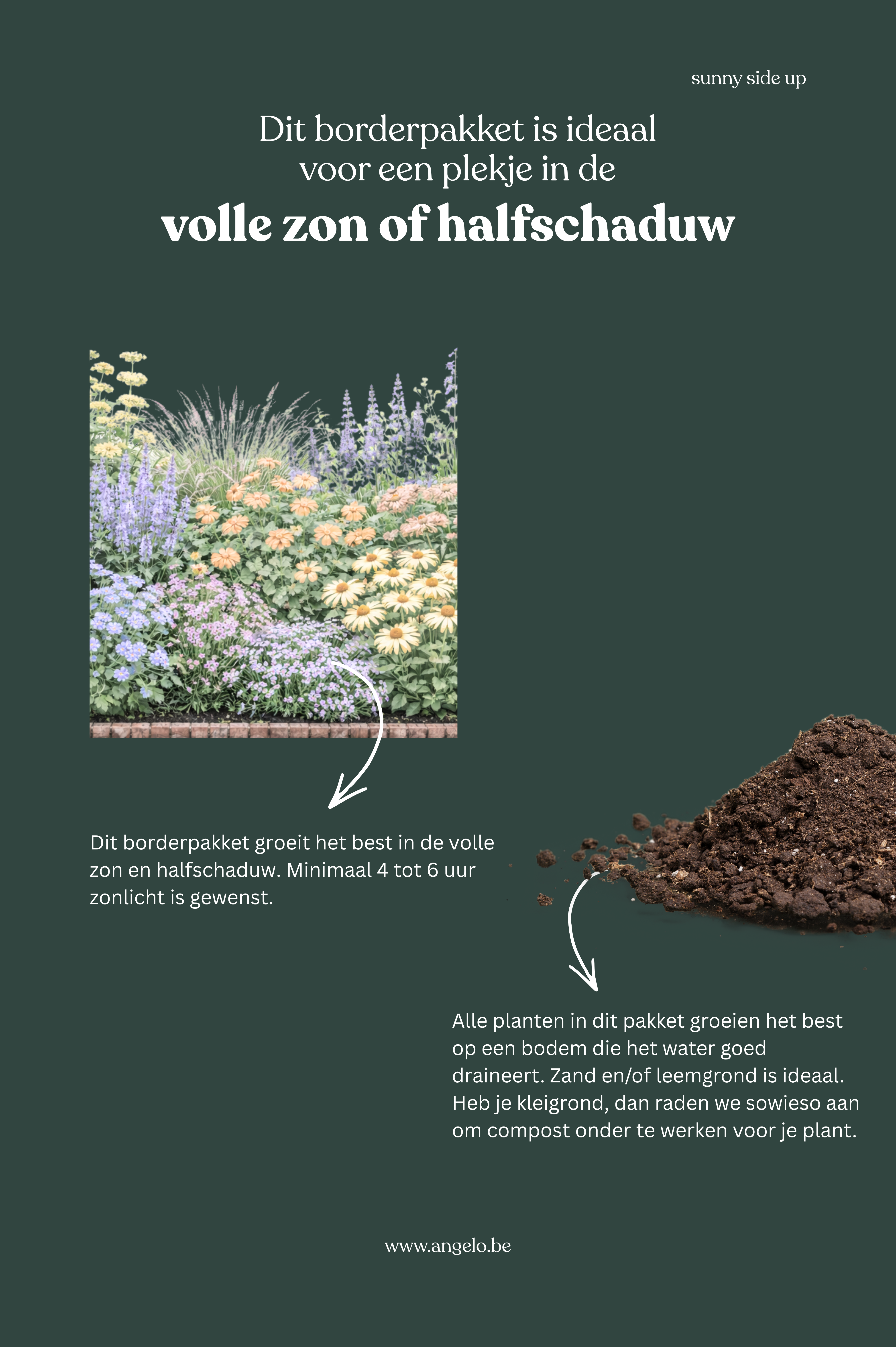 Deze border is erg geschikt voor een zonnige standplaats met goed doorlatende, niet te rijke grond. Alle planten zijn winterhard en droogtetolerant zodra ze eenmaal goed zijn gesetteld, ideaal voor een onderhoudsvriendelijke border. Laat de uitgebloeide stelen van Phlomis, zonnehoed en Pennisetum staan tot het voorjaar: ze bieden winterse structuur én een schuilplaats voor insecten. De Sunny Side Up border is ecologisch waardevol en heeft een bijzondere aantrekkingskracht op hommels, vlinders en zweefvliegen.
